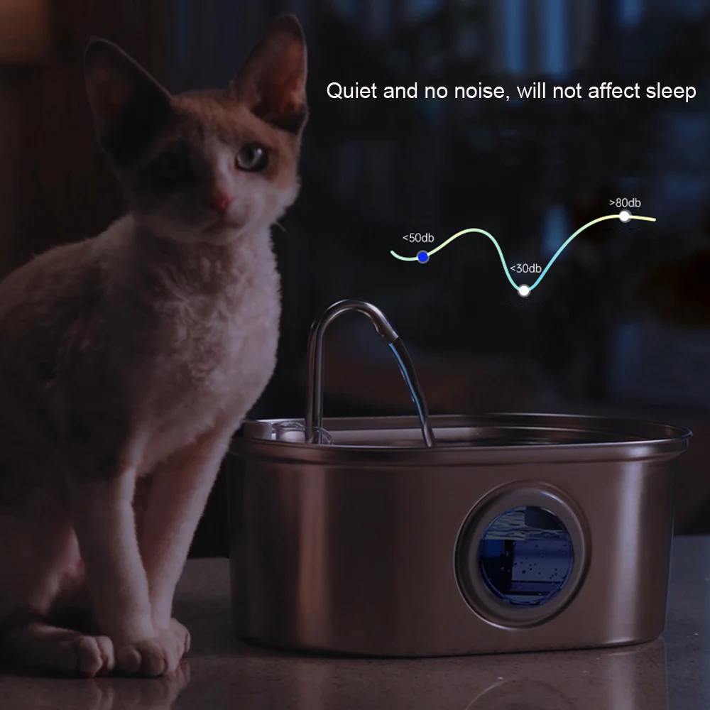 The cat water fountain is made of 304 stainless steel, and more durable and orrosion resistant. BPA free and dishwasher safe, easy to clean.