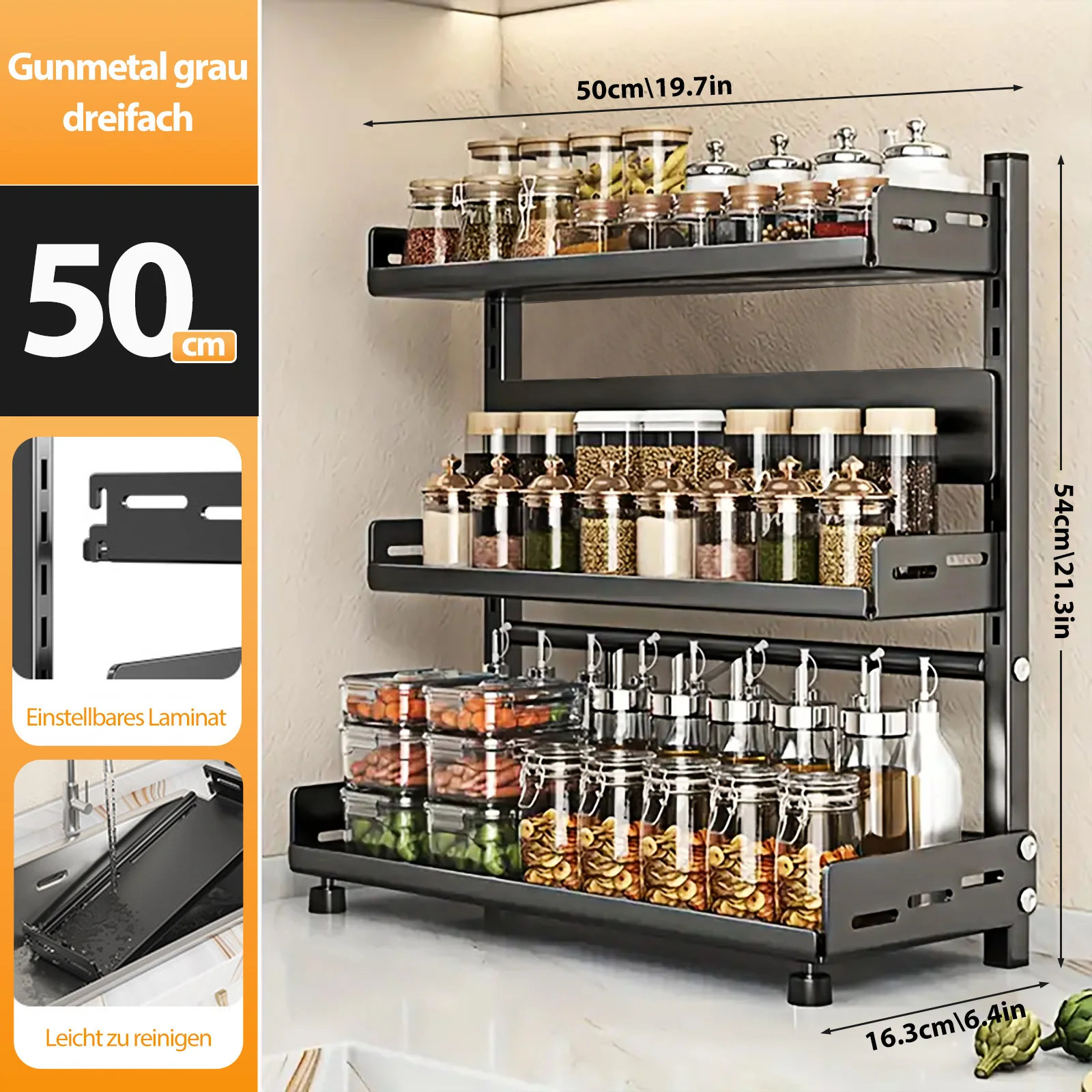 Extra large capacity storage: The standing spice rack has a sophisticated 3-tier structure, with the level 54 cm high, so that even high spice bottles and bulky kitchen appliances can be easily stored and you no longer have to worry about finding the right place. Each tier of the shelf is carefully planned, vertical storage organizes the originally overloaded countertop elements neatly, freeing up more valuable countertop space.