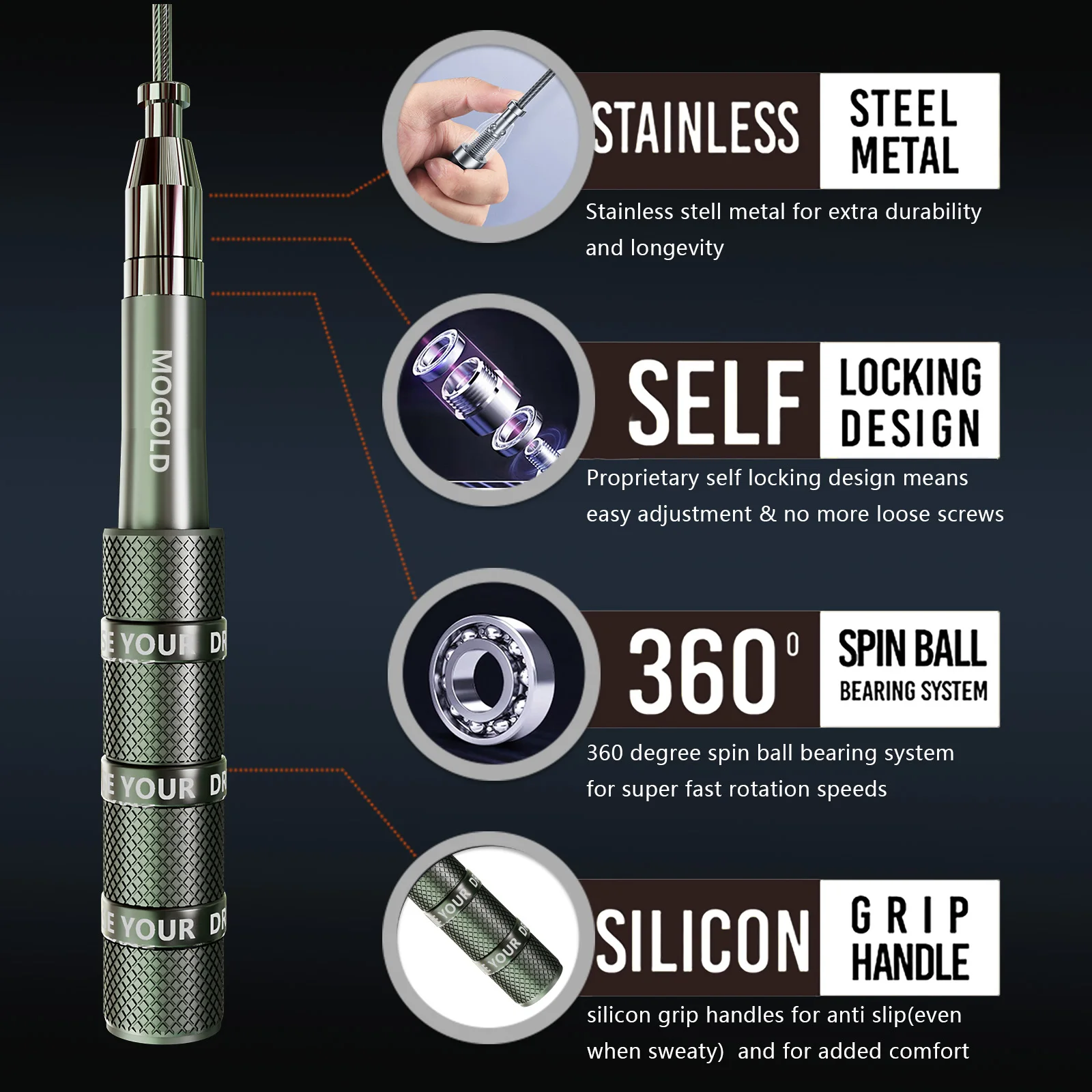 With well-designed bearings it ensures that the jump rope is still smooth and smooth when rotating at high speed, reducing stuck and winding, improving your exercise efficiency and fun.